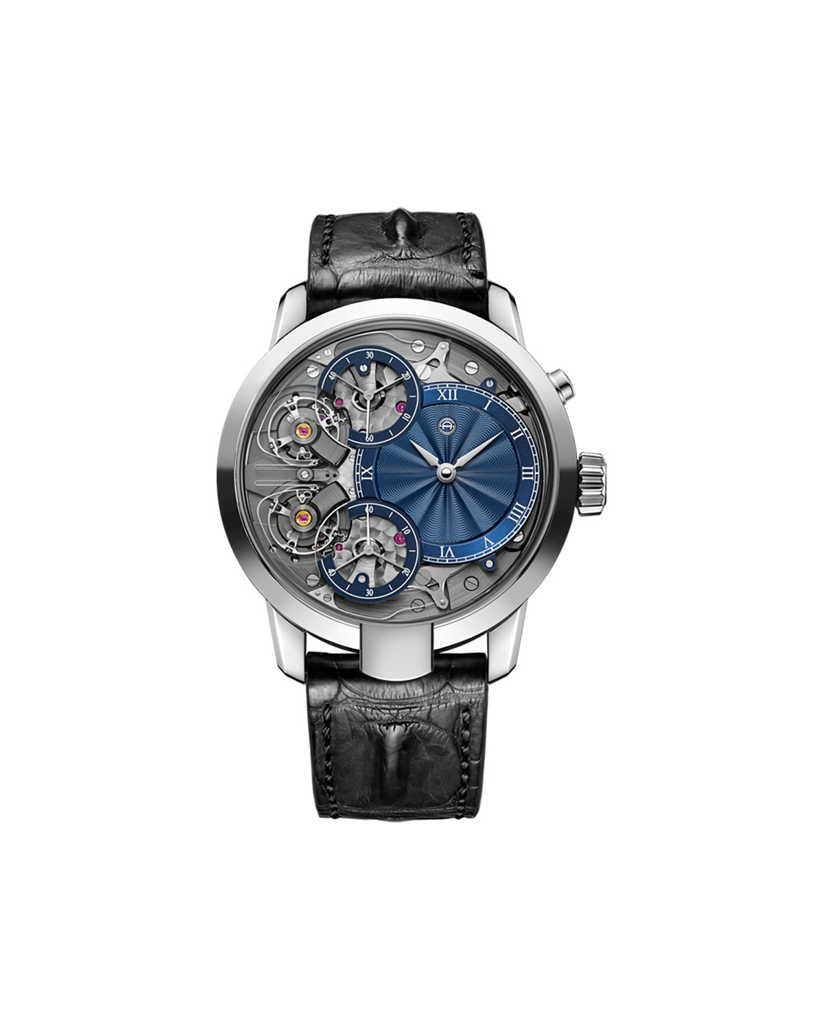 Two independent movements synchronize and are connected by the resonance clutch spring. Manual winding , steel, 5 ATM 2 barrels/gear-trains/escapements/balances Twin Second Flyback, 48 hours power reserve Black alligator horn-back and black rubber strap