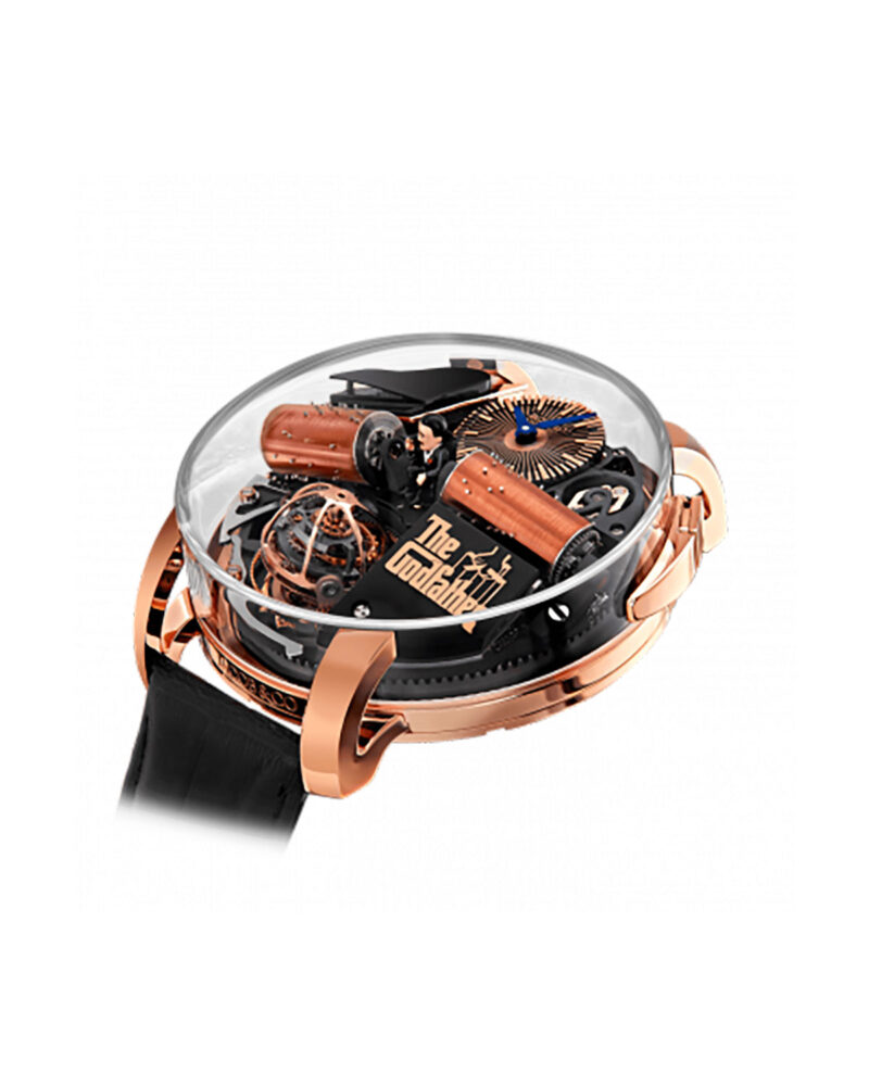 The Opera Godfather Musical Watch combines the world of ultra-high-end watchmaking with the breathtaking romantics and complexity of a mechanical musical box that plays the stirring theme music of Francis Ford Coppola’s The Godfather. A true Grand Complication timepiece, the Opera Godfather is powered by its exclusive, 658-component JCFM04 movement; a caliber of absolutely peerless construction and an unmatched capacity to amaze and entertain.