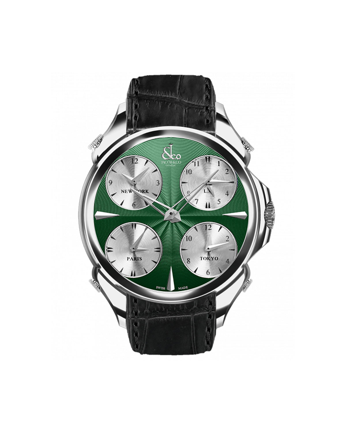 Perfect for any world explorer, this cosmopolitan timepiece features a classically styled, five time zone dial indicating the hour of the home location and the time in New York, Los Angeles, Tokyo, and Paris. Each of the five generously proportioned dials feature sword?shaped hands and finely cut markers that have an unmistakable retro flair.