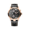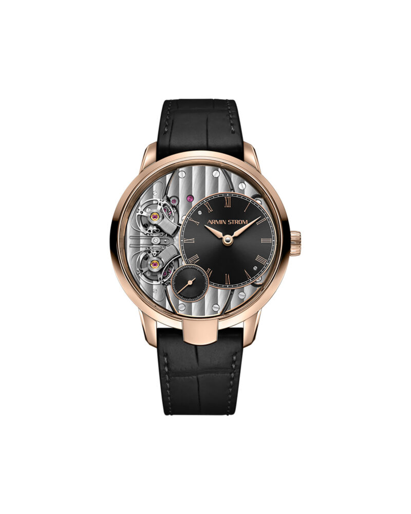Two independent movements synchronize and Fire are connected by the resonance clutch spring. Manual winding , 18 ct rose gold, 5 ATM 2 barrels/gear-trains/escapements/balances Small second, 48 hours power reserve Black alligator and black rubber strap